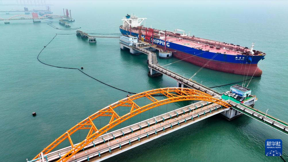 5月20日,在山东港口日照港岚山港区原油码头,船舶停泊作业(无人机照片)。
