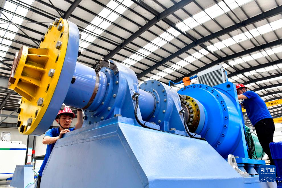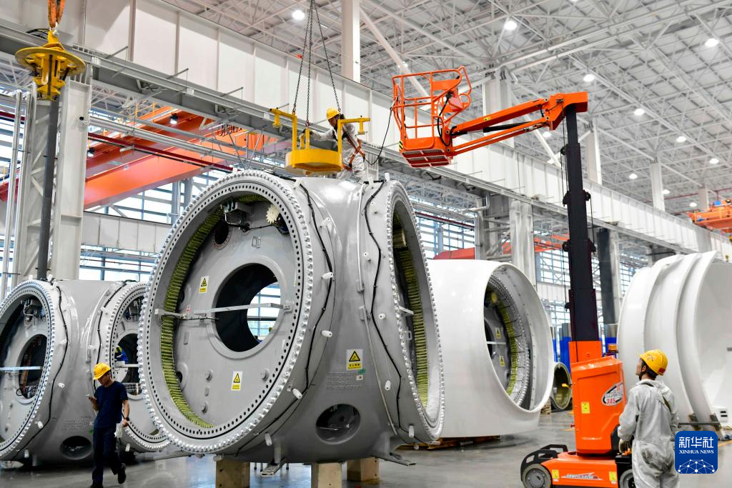 5月20日,三一重能(日照)风电设备制造基地工作人员在风电设备生产车间作业。