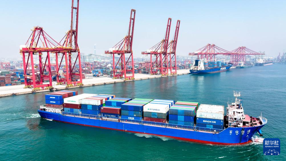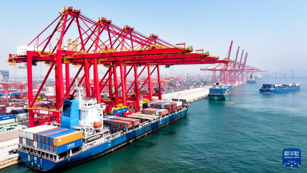 5月20日,在山东港口日照港集装箱码头,满载集装箱的船舶驶离港口。
