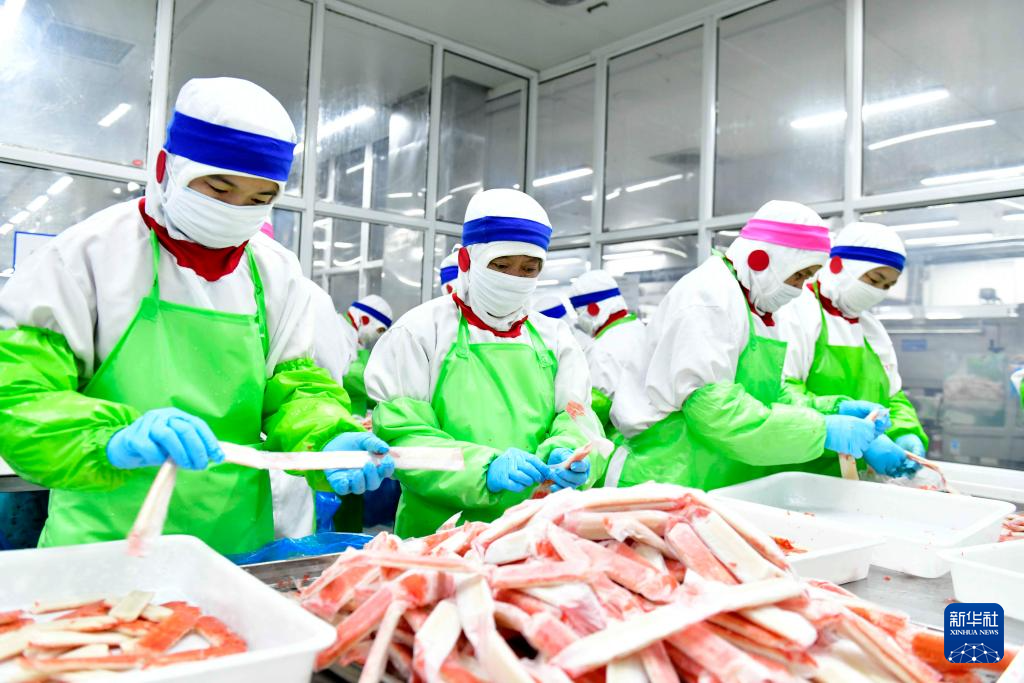 5月20日,山东美佳集团有限公司工作人员在加工出口的蟹肉棒。