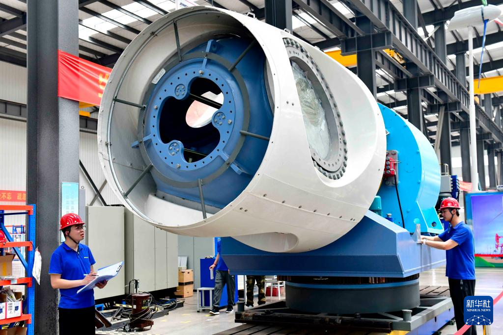 5月21日,金马新能源有限公司工作人员在装配风电设备。