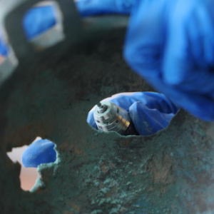 5月22日,来自新疆维吾尔自治区博物馆的参赛选手刘子虔在金属文物修复比赛中。