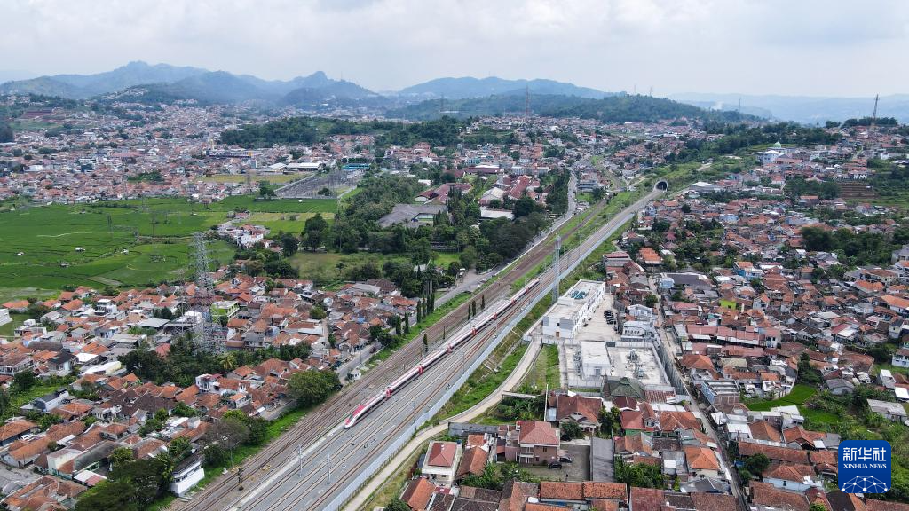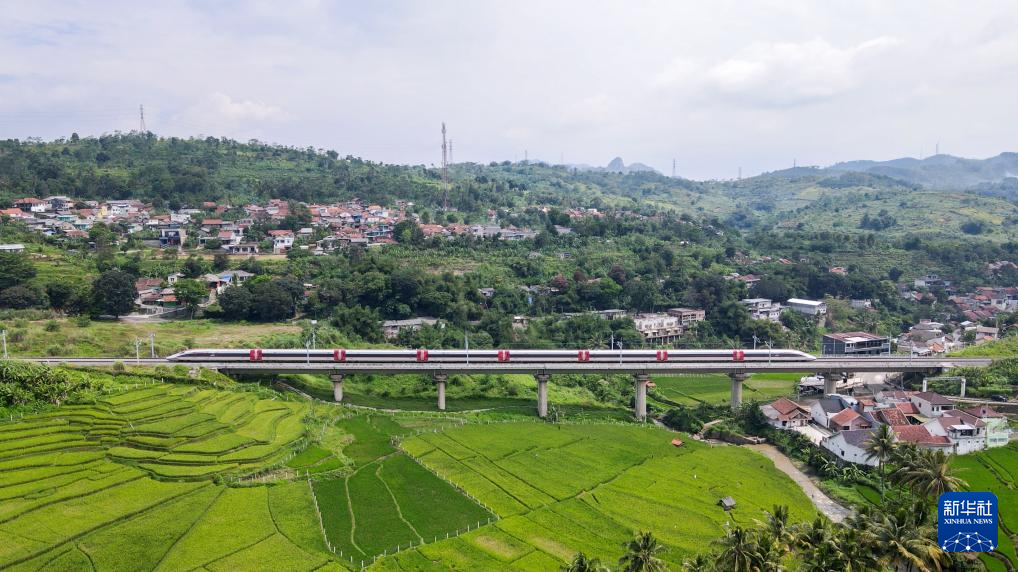 5月20日,在印度尼西亚帕达拉朗,一列高速动车组列车行驶在雅万高铁沿线(无人机照片)。