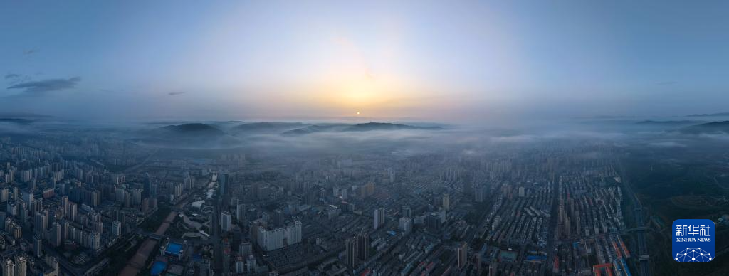 这是5月22日拍摄的青海省西宁市日出景象(无人机全景照片)。
