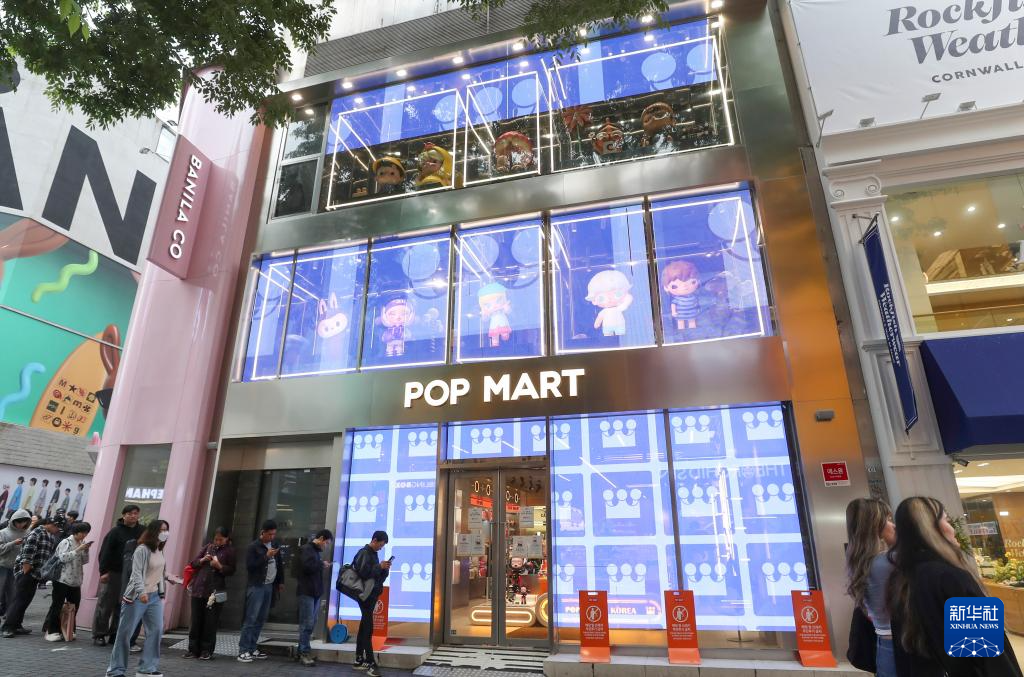 5月20日,顾客在韩国首尔明洞街区的泡泡玛特店面前排队。