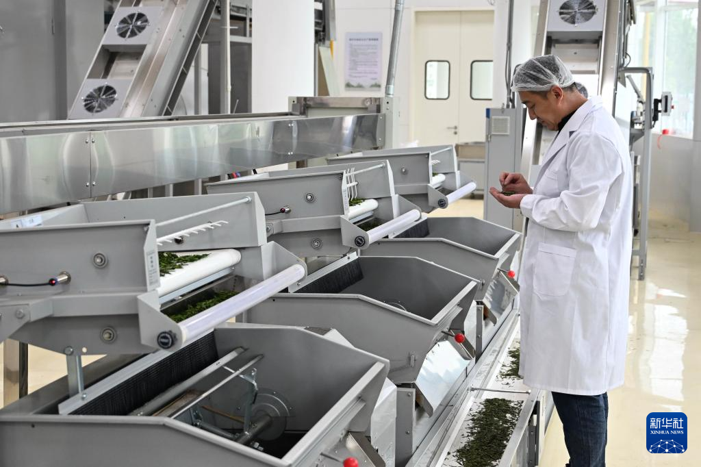 5月22日,工作人员在位于日照市岚山区的日照茶叶科创示范园车间检查茶叶质量。