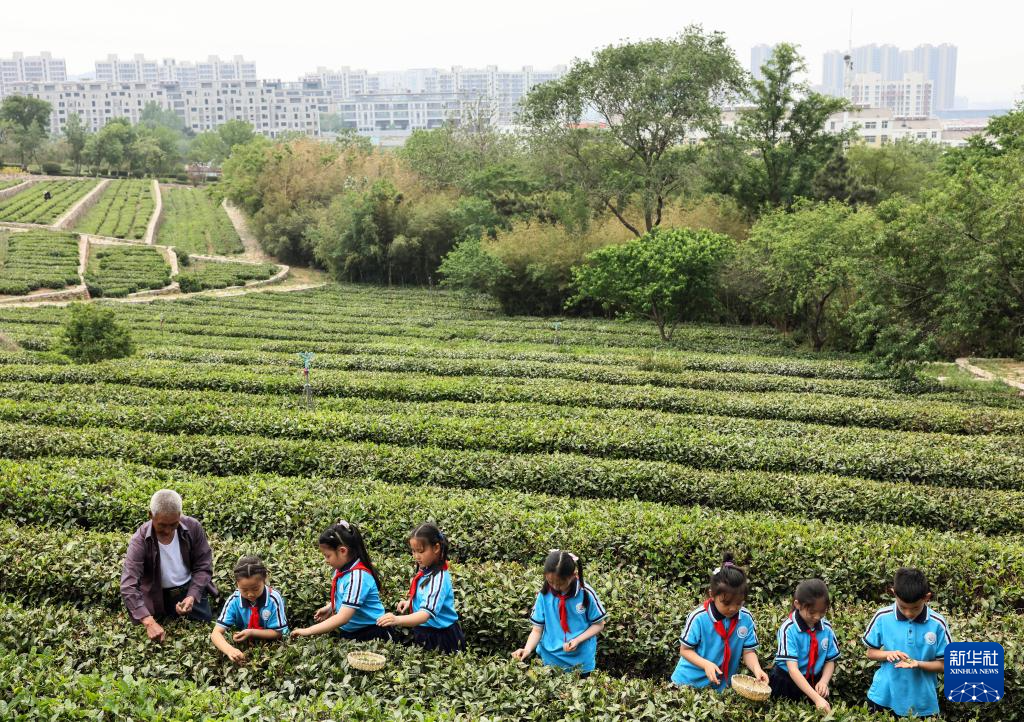 5月22日,参加研学活动的学生在日照市岚山区“北门外1966”茶园采茶。
