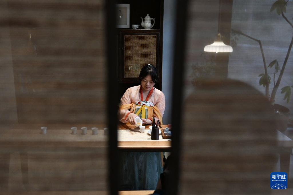 5月22日,茶艺师在日照市岚山区云隐小镇的茶室为游客演示茶艺。