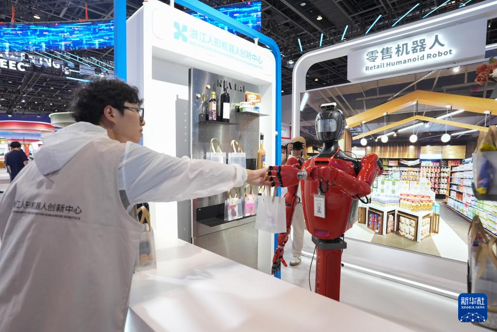 5月22日,浙江人形机器人创新中心工作人员在“数智中东欧”展区展示一款零售机器人。