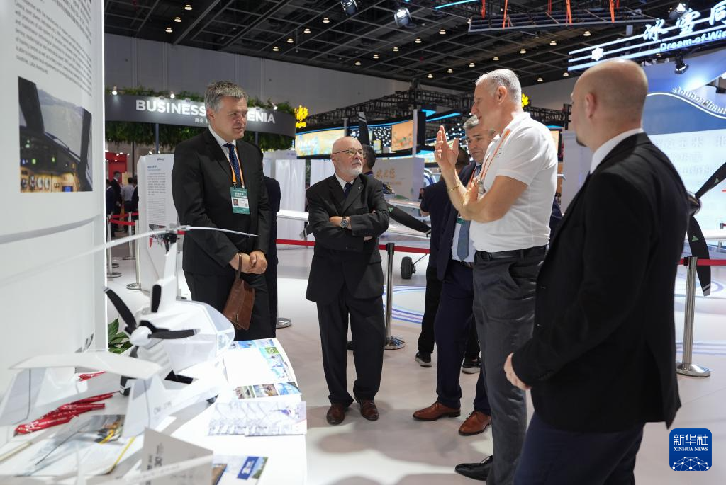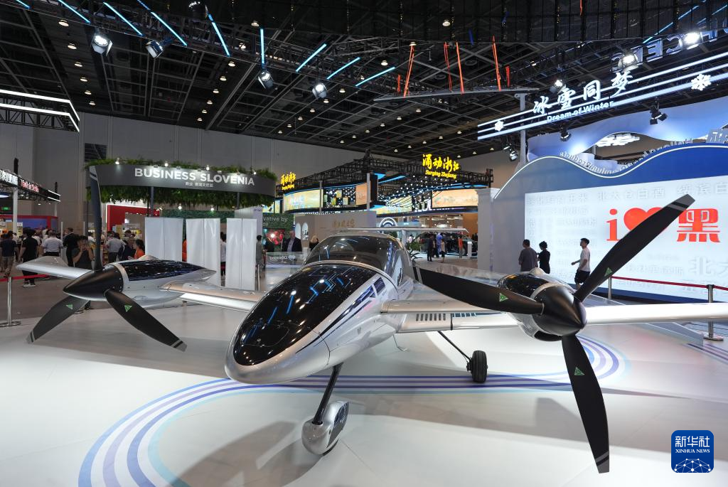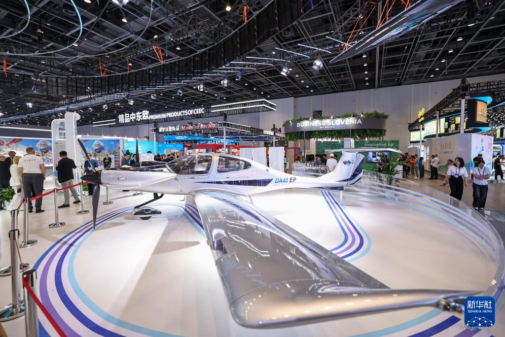 这是5月22日在“数智中东欧”展区拍摄的浙江万丰集团旗下奥利地钻石飞机公司研发的一款混合动力飞机。
