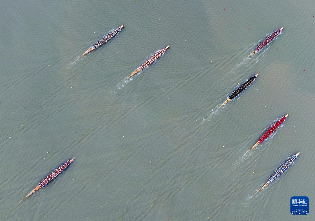 5月23日,参赛龙舟队在比赛中角逐(无人机照片)。