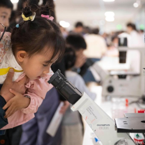 5月24日,在中国农业科学院哈尔滨兽医研究所,一名小朋友现场体验实验设备。