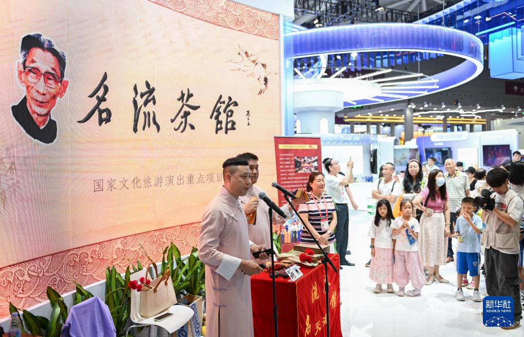 5月24日,在文博会天津展区,名流茶馆的快板表演吸引孩子们驻足观看。