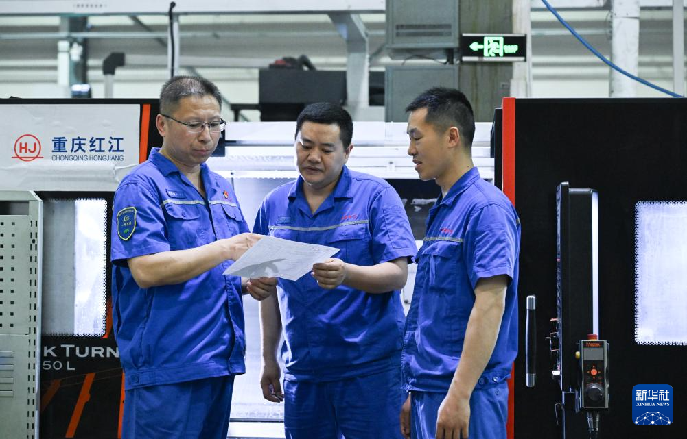 5月23日,傅国涛(左一)在重庆红江机械有限责任公司生产车间与同事交流。