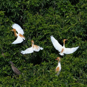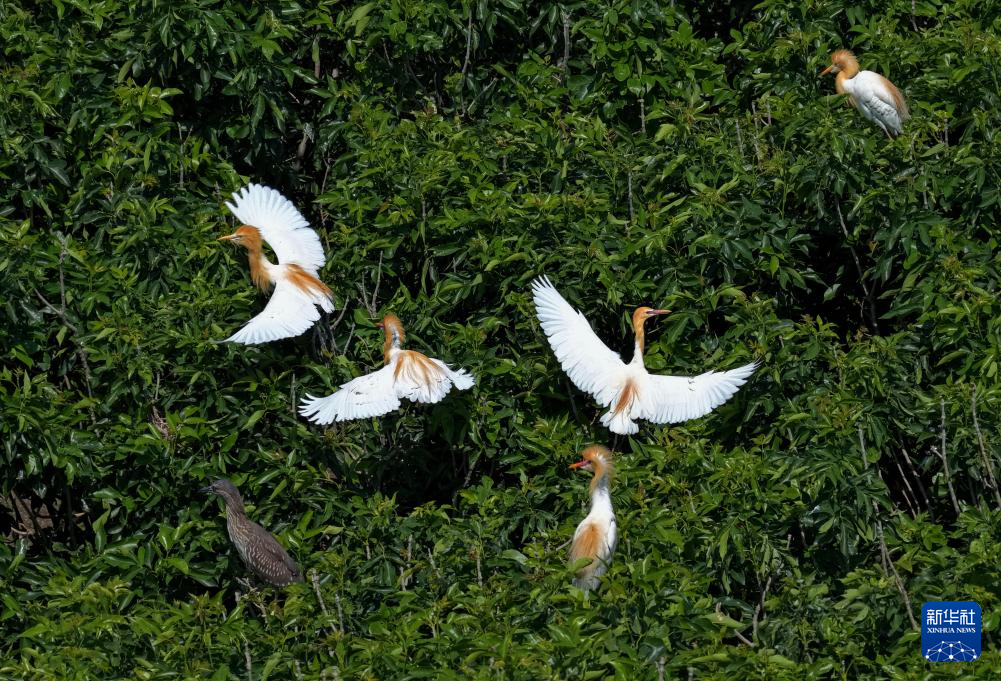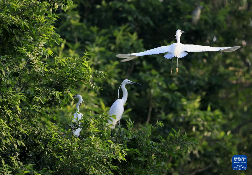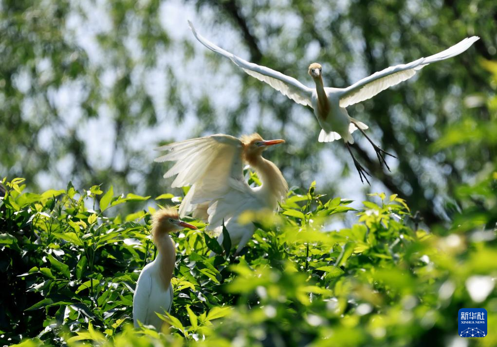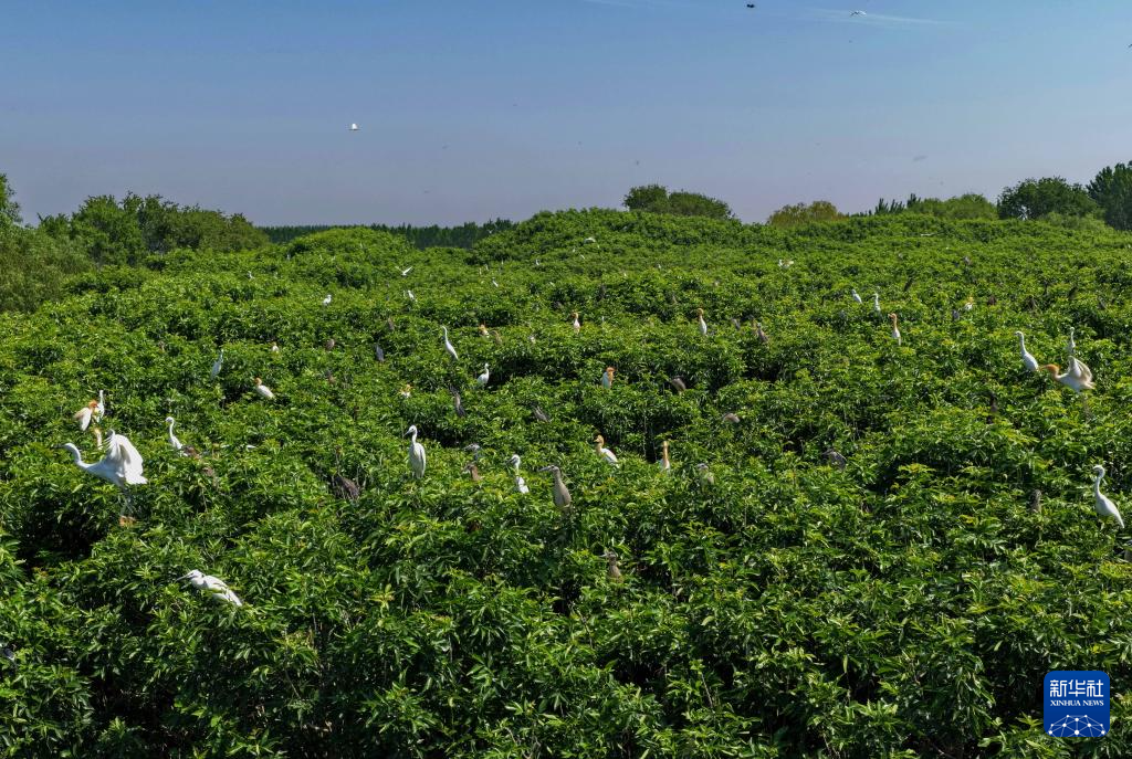 近日,河北省唐山市丰南区生态环境优良的沿海林地吸引了大批白鹭、牛背鹭、夜鹭和苍鹭等鹭科鸟类在此栖息繁衍,绘就出一幅幅优美和谐的生态画卷。