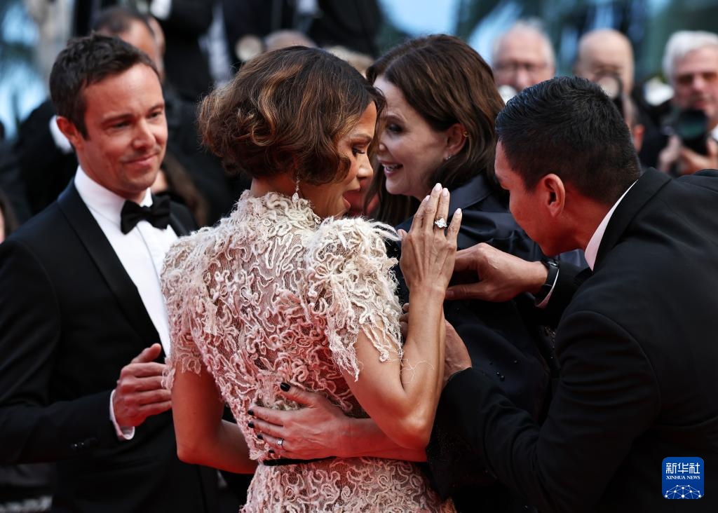 5月24日,在法国南部小城戛纳,主竞赛单元评委会主席、法国女演员朱丽叶·比诺什(右二)与评委、美国演员哈莉·贝瑞(左二)的衣服勾在一起。