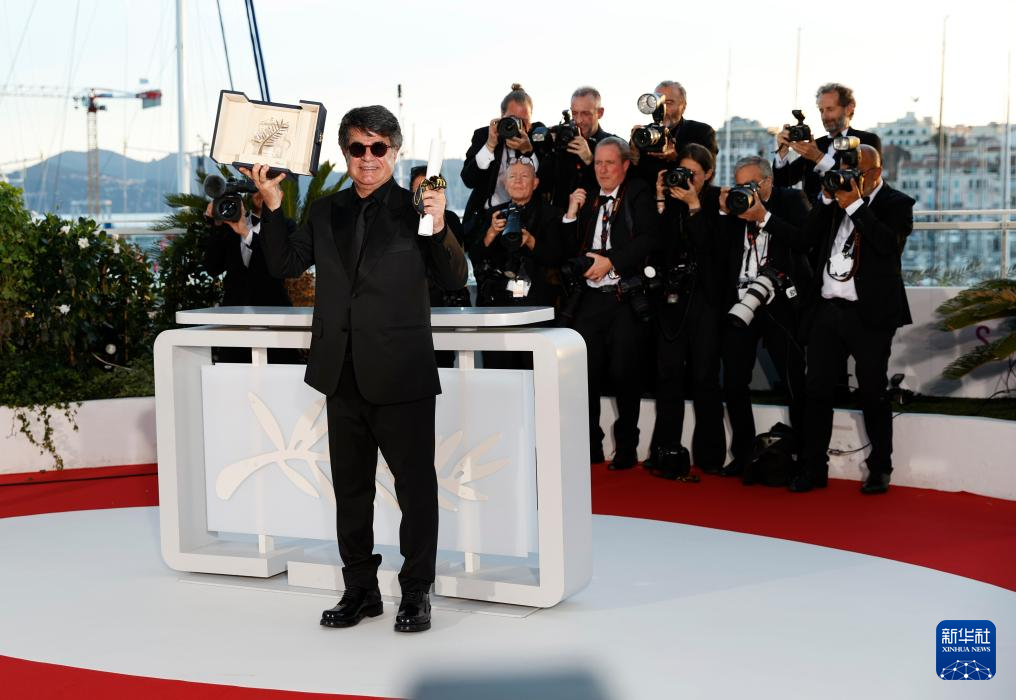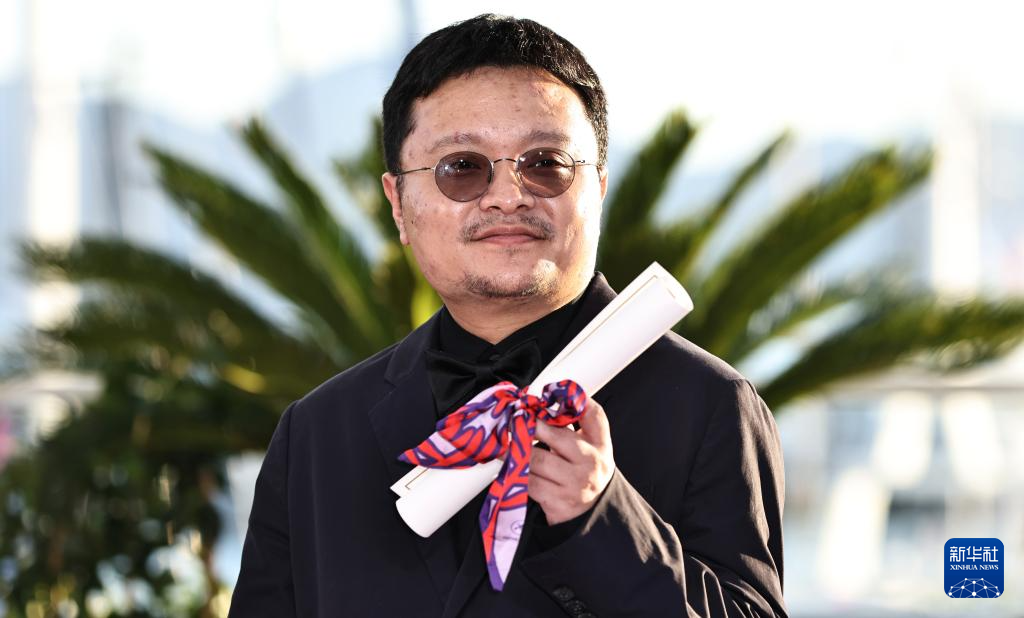 5月24日,在法国南部小城戛纳,中国导演毕赣出席颁奖典礼之后的拍照式。
