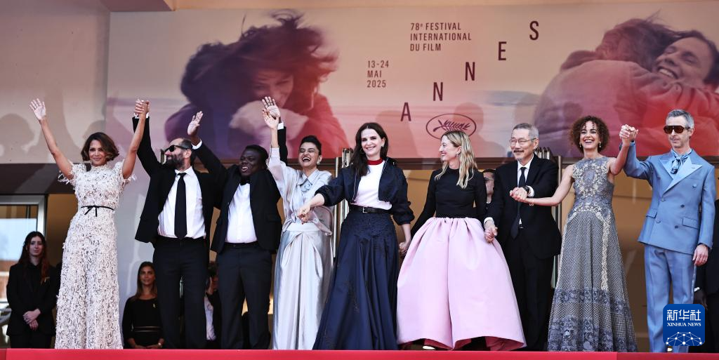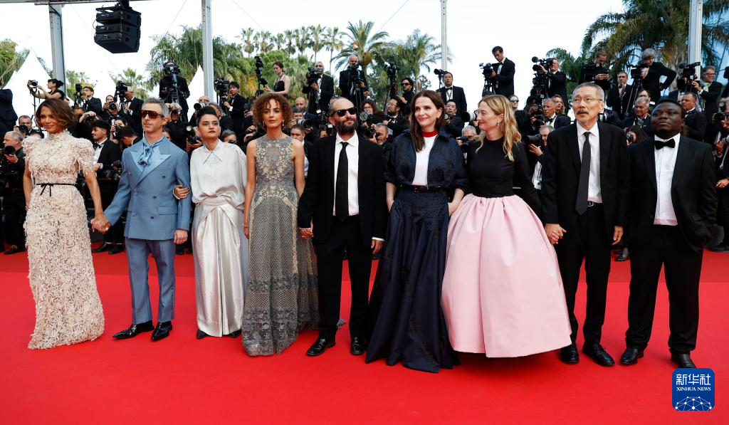 5月24日,在法国南部小城戛纳,主竞赛单元评委会主席、法国女演员朱丽叶·比诺什(中)携众评委踏上闭幕式红毯。