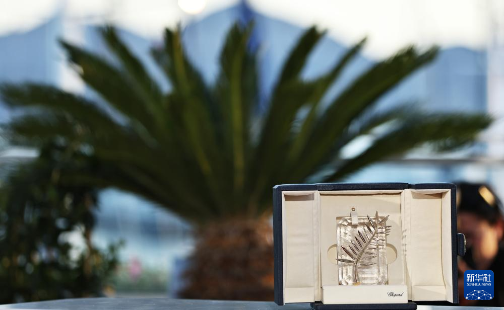 这是5月24日在法国南部小城戛纳拍摄的第78届戛纳国际电影节最高奖——“金棕榈奖”的奖杯。