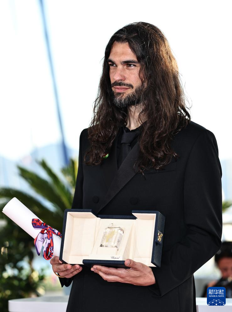 5月24日,在法国南部小城戛纳,巴西导演小克莱贝·门东萨出席颁奖典礼后的拍照式。小克莱贝·门东萨凭影片《秘密特工》获得最佳导演奖,该片主演瓦格纳·莫拉获得最佳男演员奖。