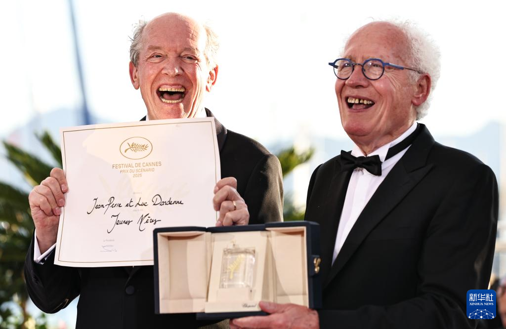 5月24日,在法国南部小城戛纳,来自比利时的达内兄弟出席拍照式。他们凭借《年轻母亲》获得最佳编剧奖。