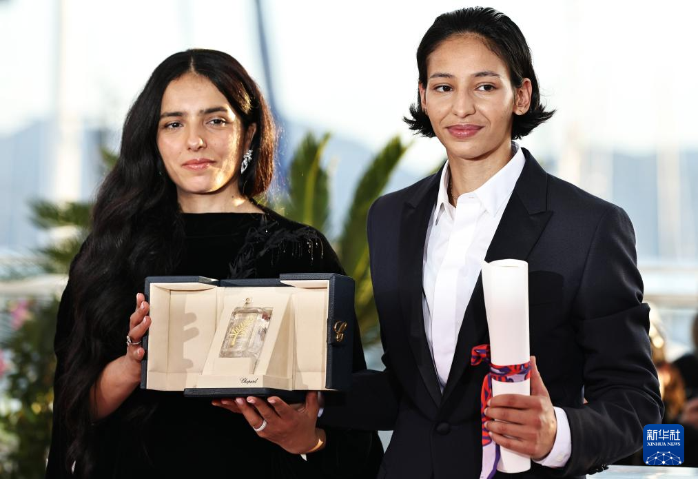 5月24日,在法国南部小城戛纳,法国演员纳迪娅·梅利蒂(右)和导演阿弗西娅·埃尔奇出席拍照式。法国、德国合拍片《最小的女儿》主演纳迪娅·梅利蒂获得最佳女演员奖。