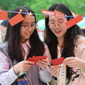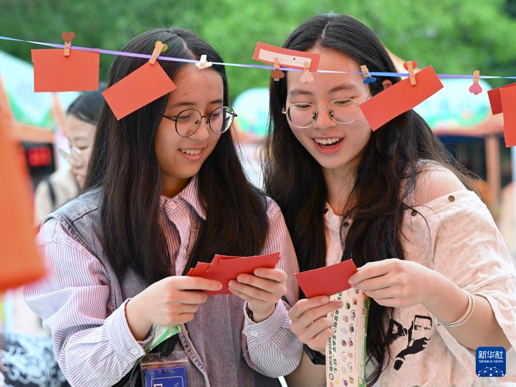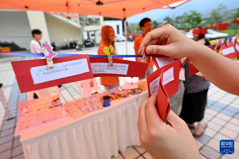 5月25日,在福州大学心理嘉年华活动上,学生在观看心理健康知识问答题卡。