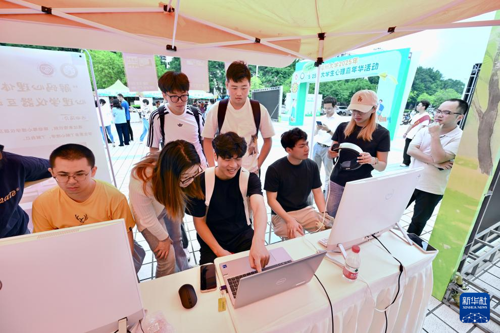 5月25日,在福州大学心理嘉年华活动上,学生在参与心理学仪器测试及互动体验。