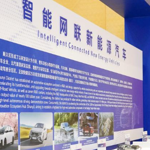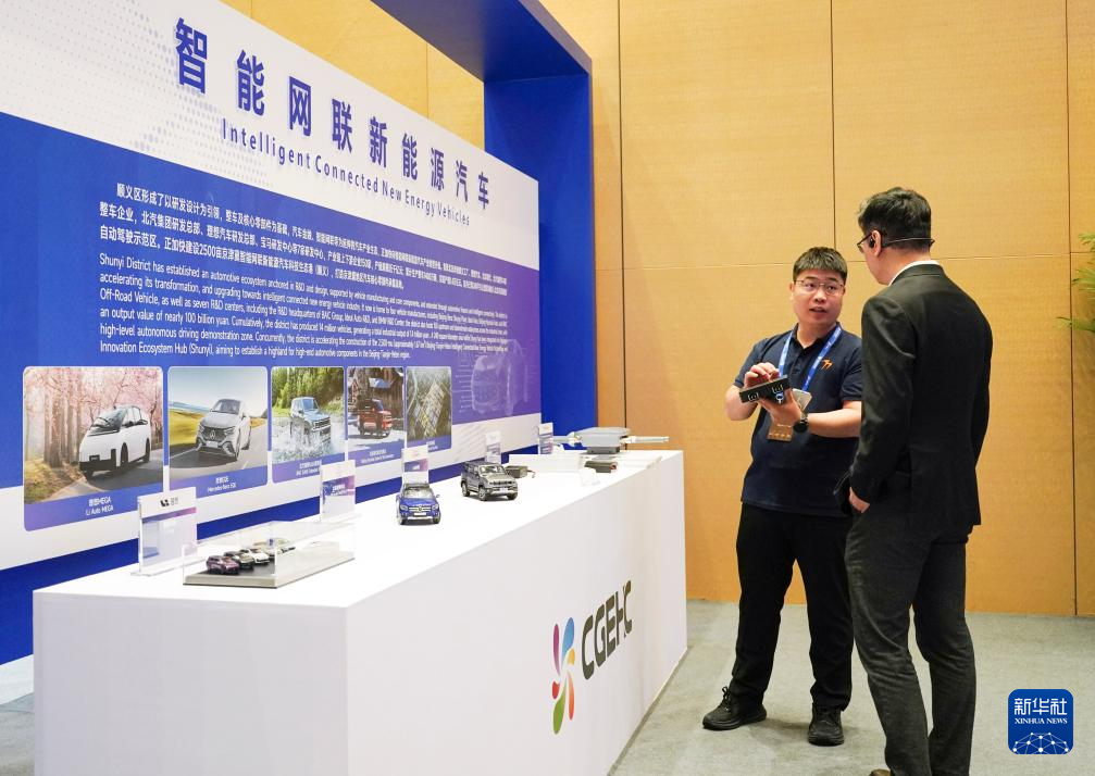 5月26日,在2025中德(欧)隐形冠军论坛经济技术展示交流活动现场,工作人员给参会人员介绍智能网联新能源汽车。