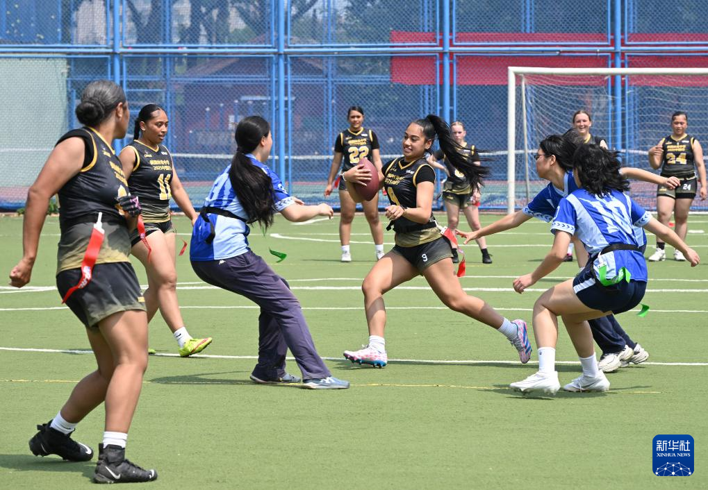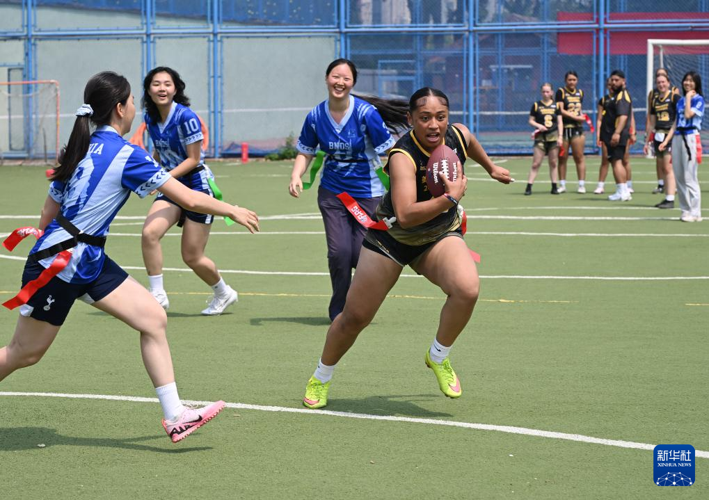5月26日,美国华盛顿州林肯高中女子腰旗橄榄球队队员同北京市十一学校学生在球场上进行友谊赛。