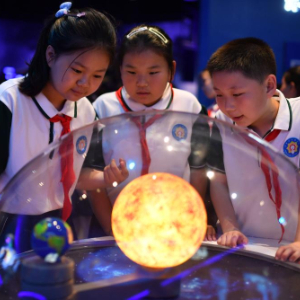 5月25日,山东省青岛市市北区开平路小学学生在青岛科技馆参观“潮汐”装置。