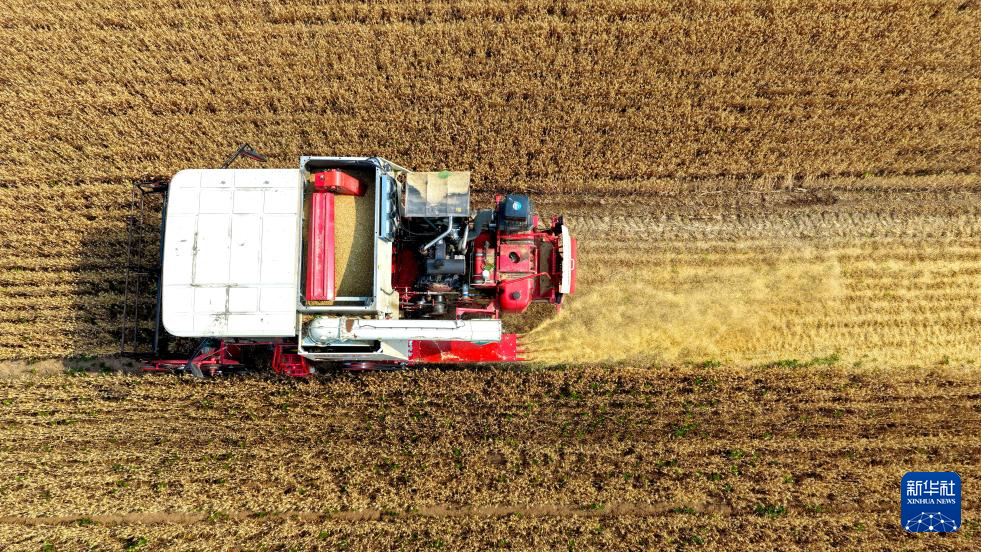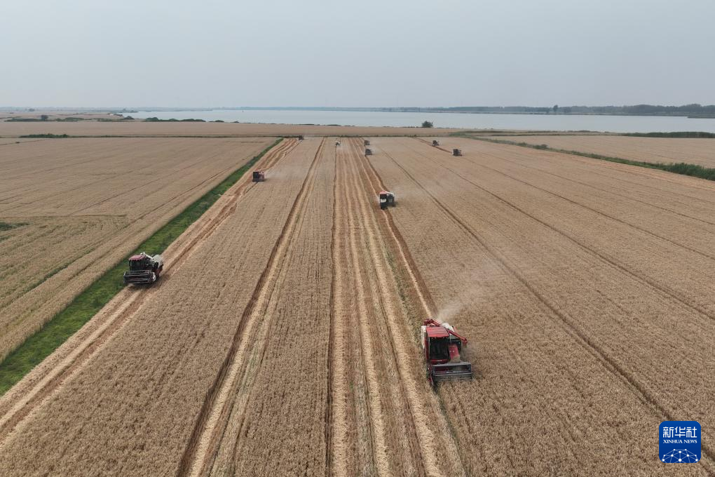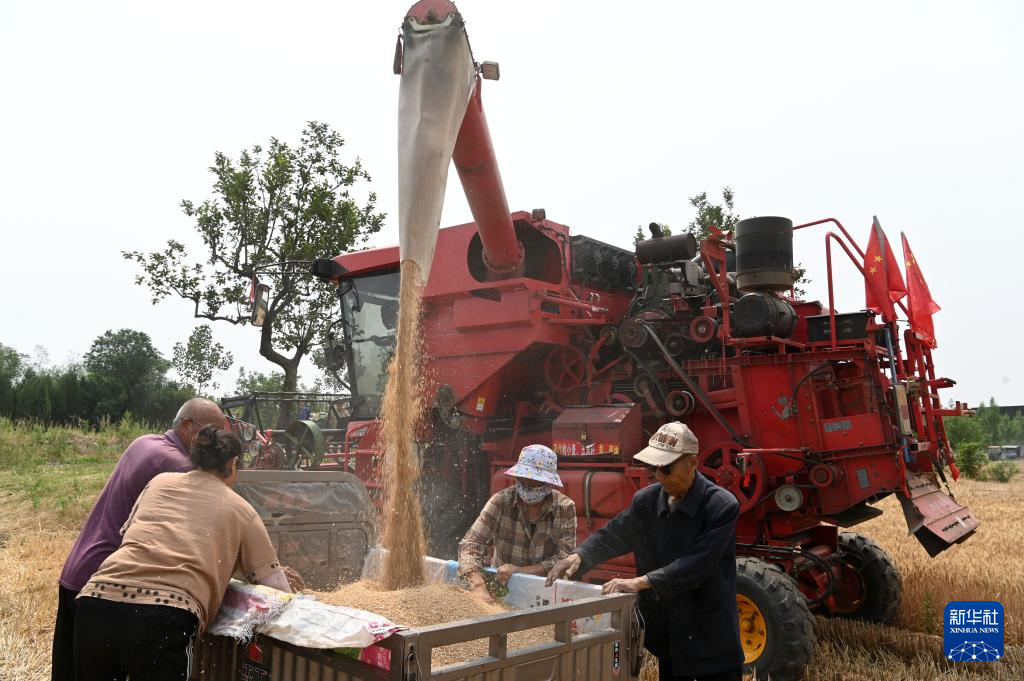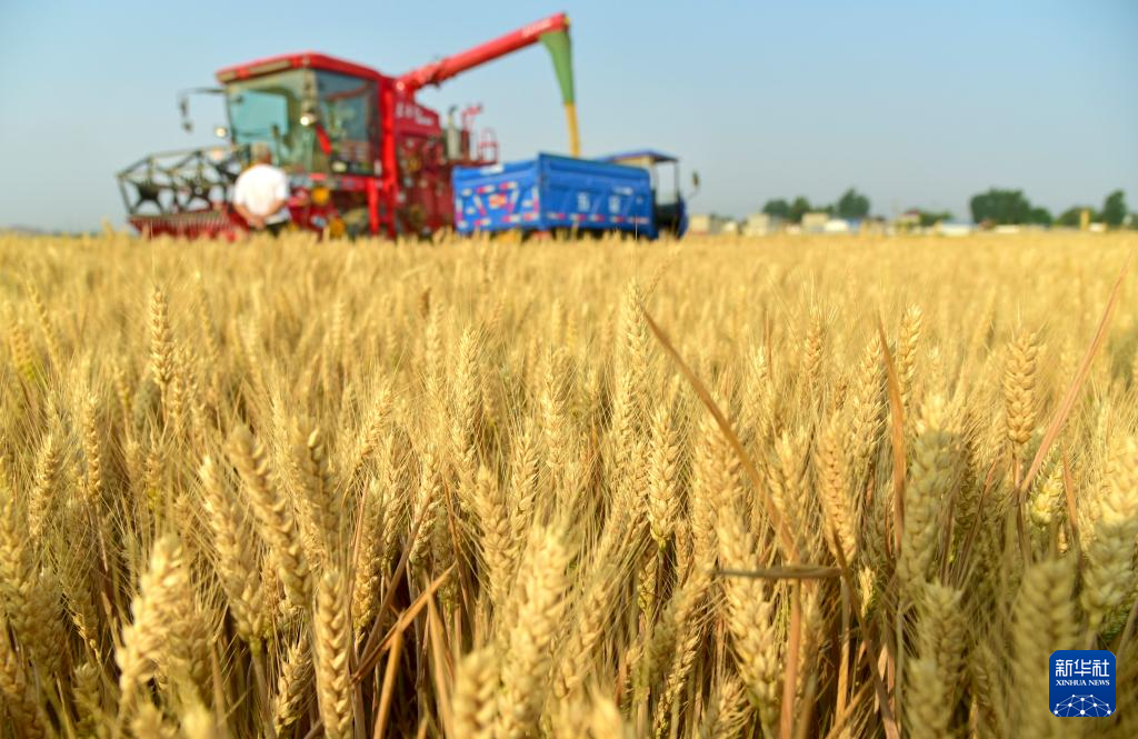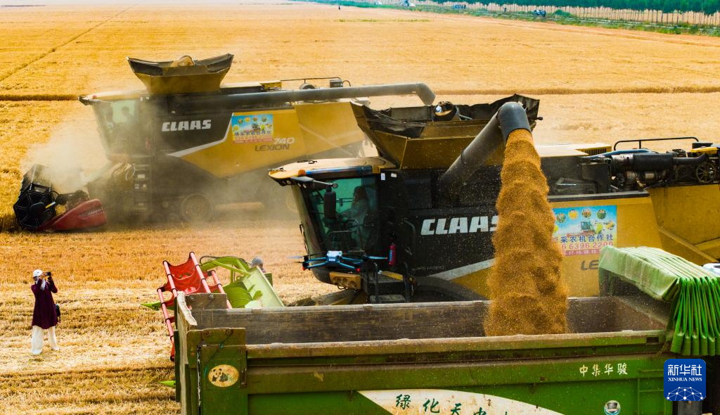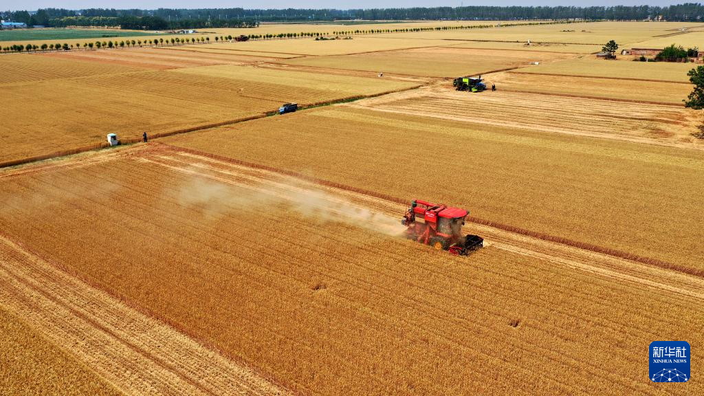 5月26日,联合收割机在河南省许昌市建安区陈曹乡高标准粮田示范园区收割小麦。