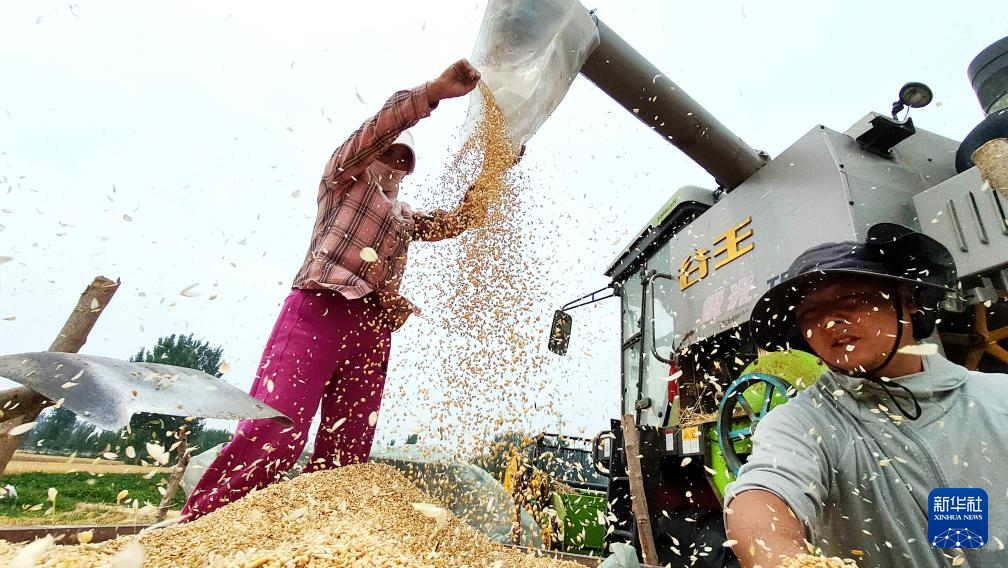 5月27日,河南省济源市五龙口镇农民从收割机上卸下刚收获的小麦。