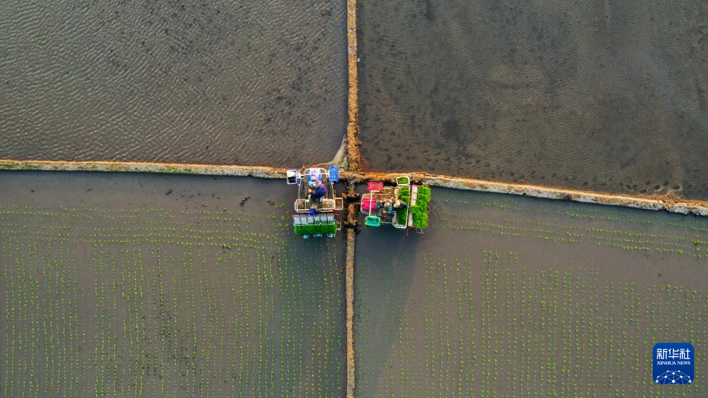 5月26日,在吉林省吉林市永吉县鑫丰种植农民专业合作社,农民驾驶农机进行水稻插秧(无人机照片)。