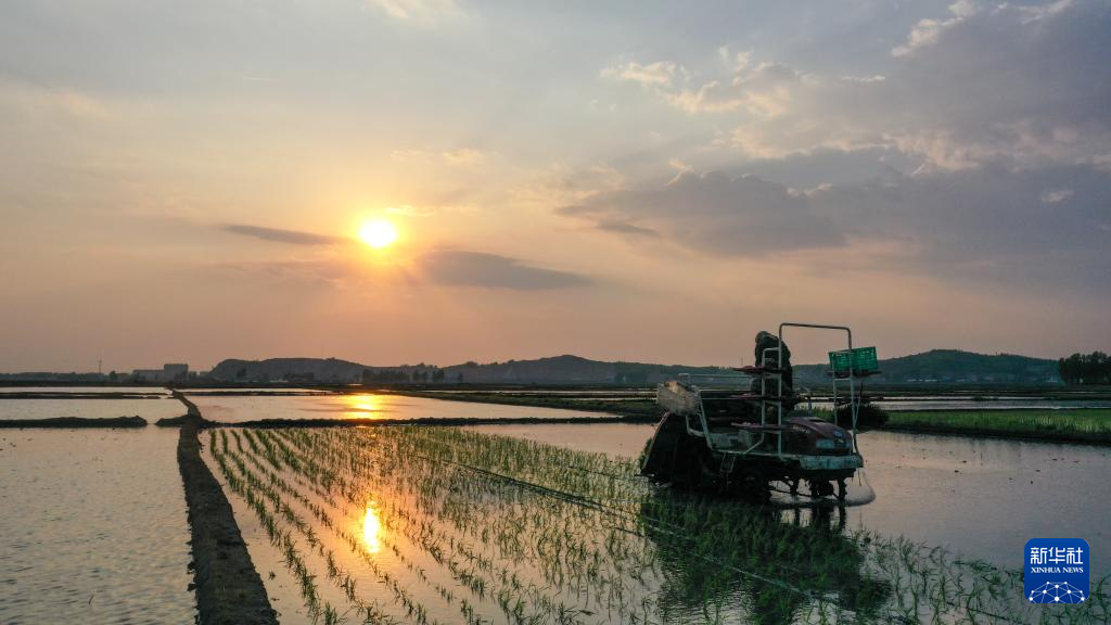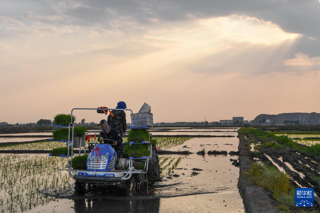5月26日,在吉林省吉林市永吉县鑫丰种植农民专业合作社,农民驾驶农机进行水稻插秧。