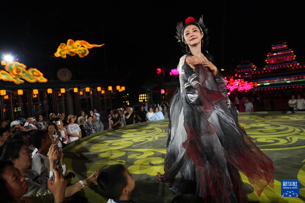5月26日,人们在安吉灵峰街道一个夜游景区观看国风表演。