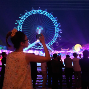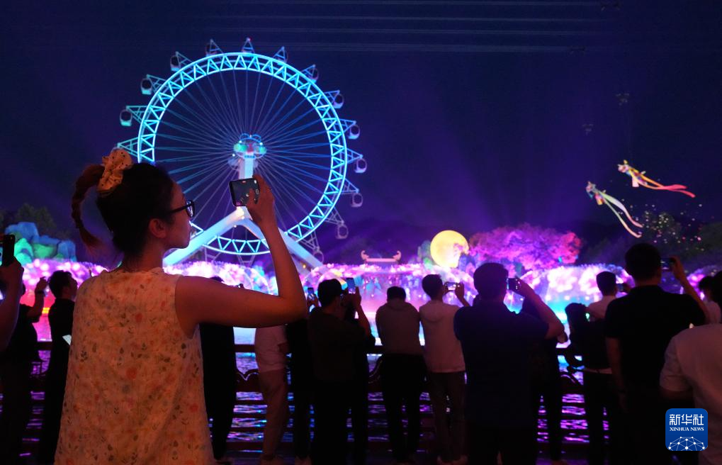 5月26日,人们在安吉灵峰街道一个夜游景区观看表演。