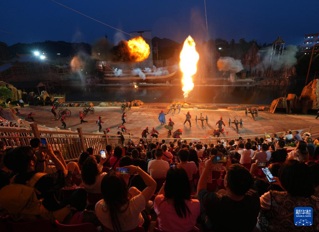 5月26日,人们在安吉灵峰街道一个夜游景区观看历史剧演出。
