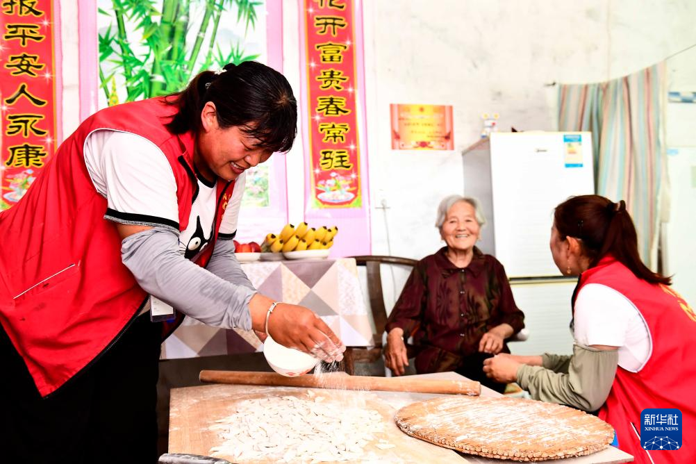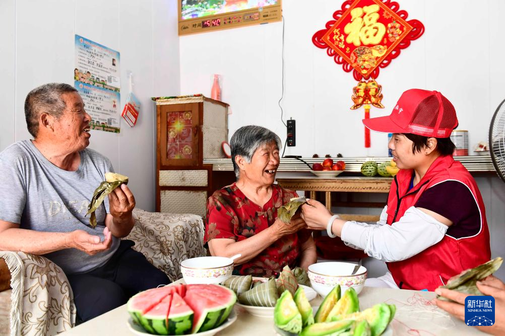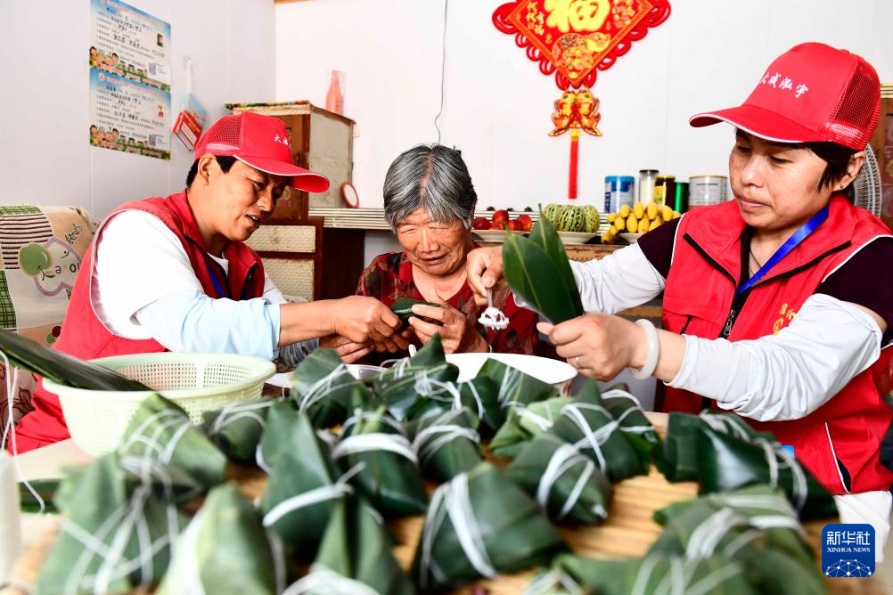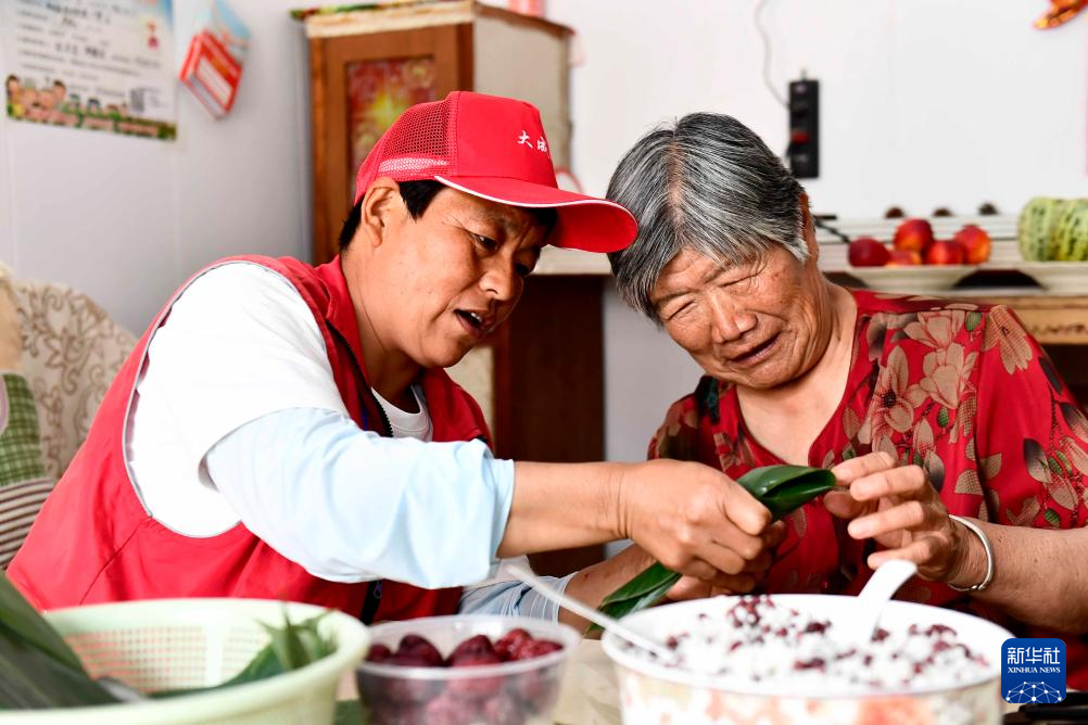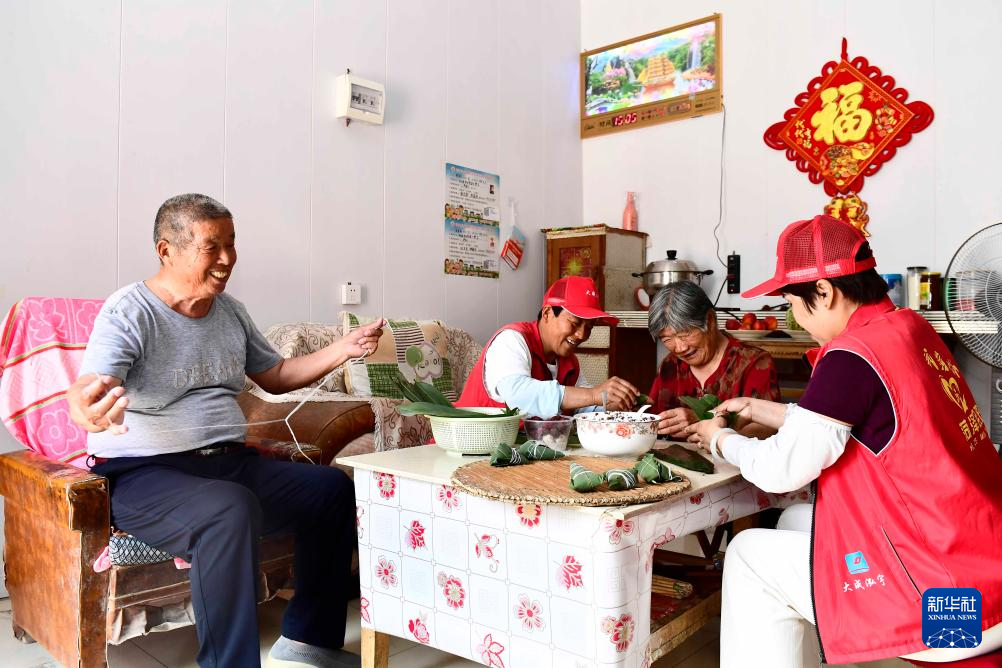 5月28日,在菏泽市郓城县郓州街道大樊庄村,居家养老服务中心的工作人员与建档立卡特困老人侯爱菊一起包粽子。
