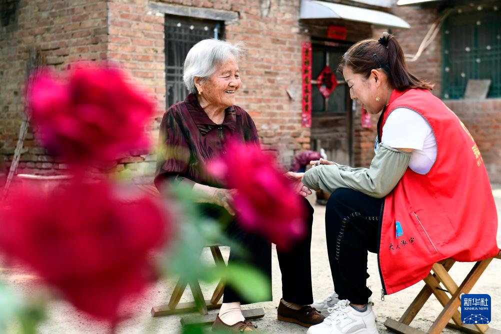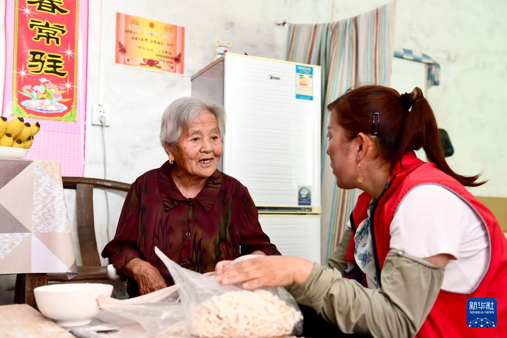 5月28日,在菏泽市郓城县唐塔街道宋屯村,居家养老服务中心的工作人员上门为92岁的建档立卡特困老人刘凤銮服务。