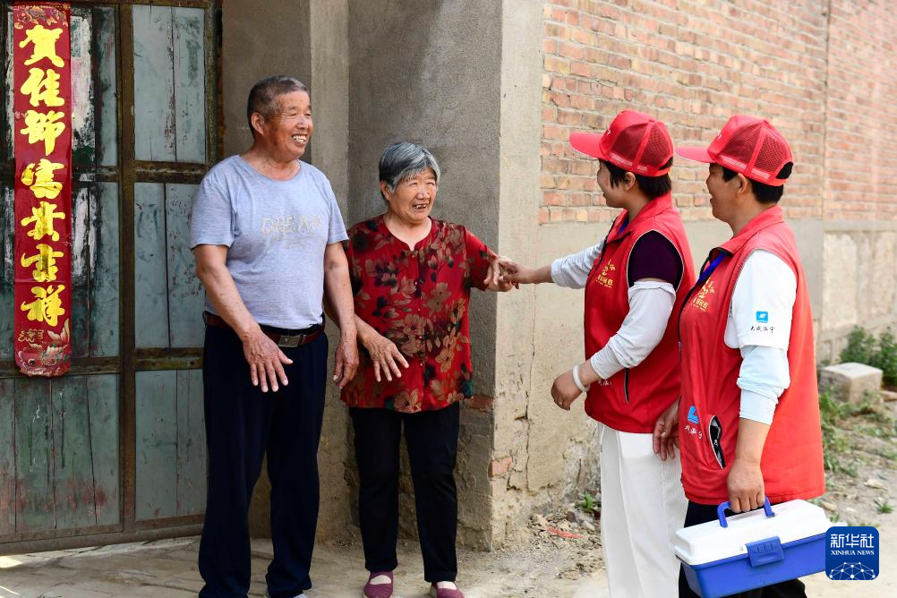 5月28日,在菏泽市郓城县郓州街道大樊庄村,居家养老服务中心的工作人员与建档立卡特困老人樊西见(左一)、侯爱菊(左二)道别。