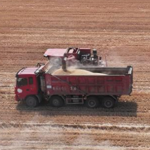 5月28日,在西安市鄠邑区庞光街道庞光村,收割机将收获的粮食装车(无人机照片)。
