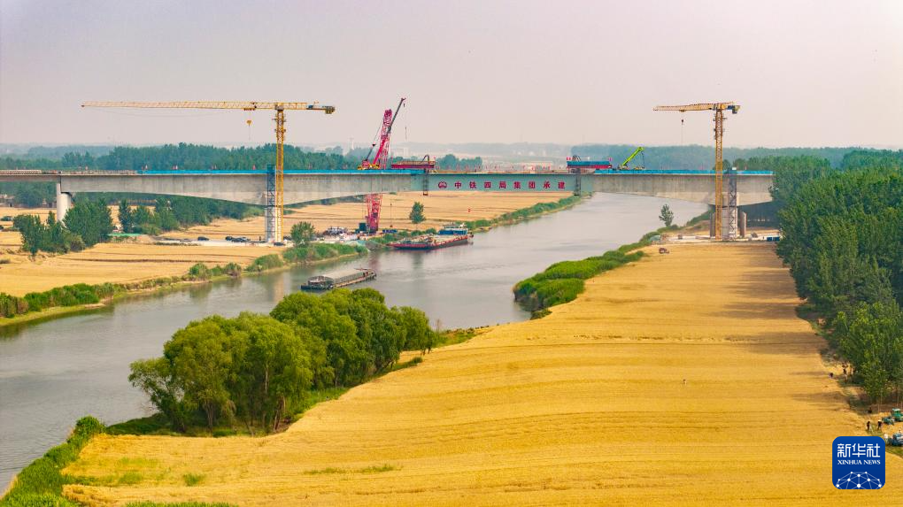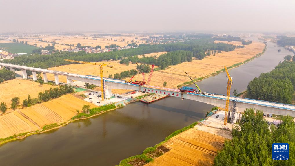 这是正在吊装施工中的阜淮铁路跨涡河特大桥(5月29日摄,无人机照片)。