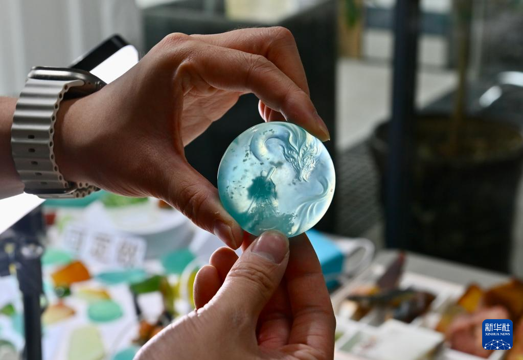 5月20日,唐校在“玉三生”工作室内展示一件融合了国潮元素的岫玉作品。