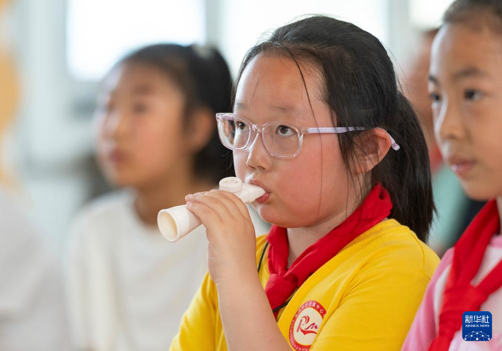 5月30日,在安达市任民镇中心学校,“村里的孩儿”音乐班的孩子在练习吹奏卡祖笛。
