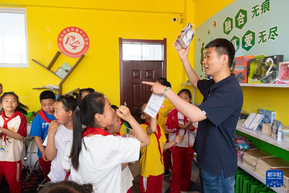 5月30日,在安达市任民镇中心学校,李平给孩子们发放用“音乐积分”兑换的奖品。