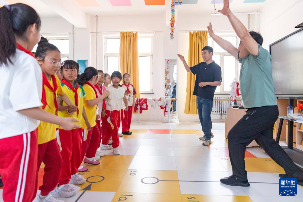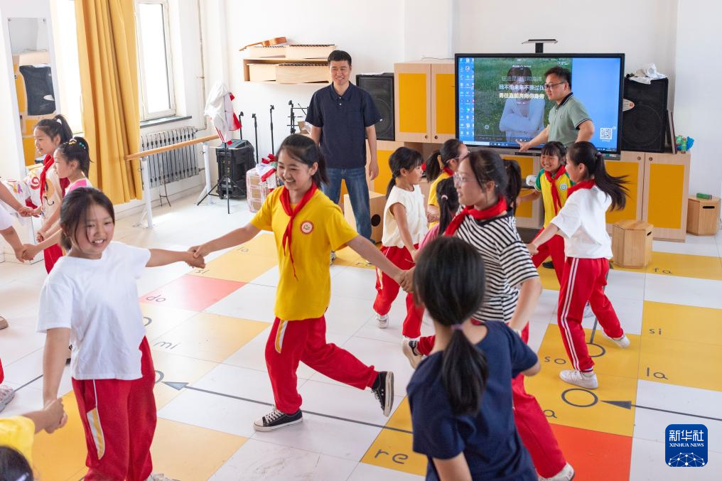 5月30日,在安达市任民镇中心学校,李平(后左)和张雨(后右)指导孩子们边合唱边跳舞。