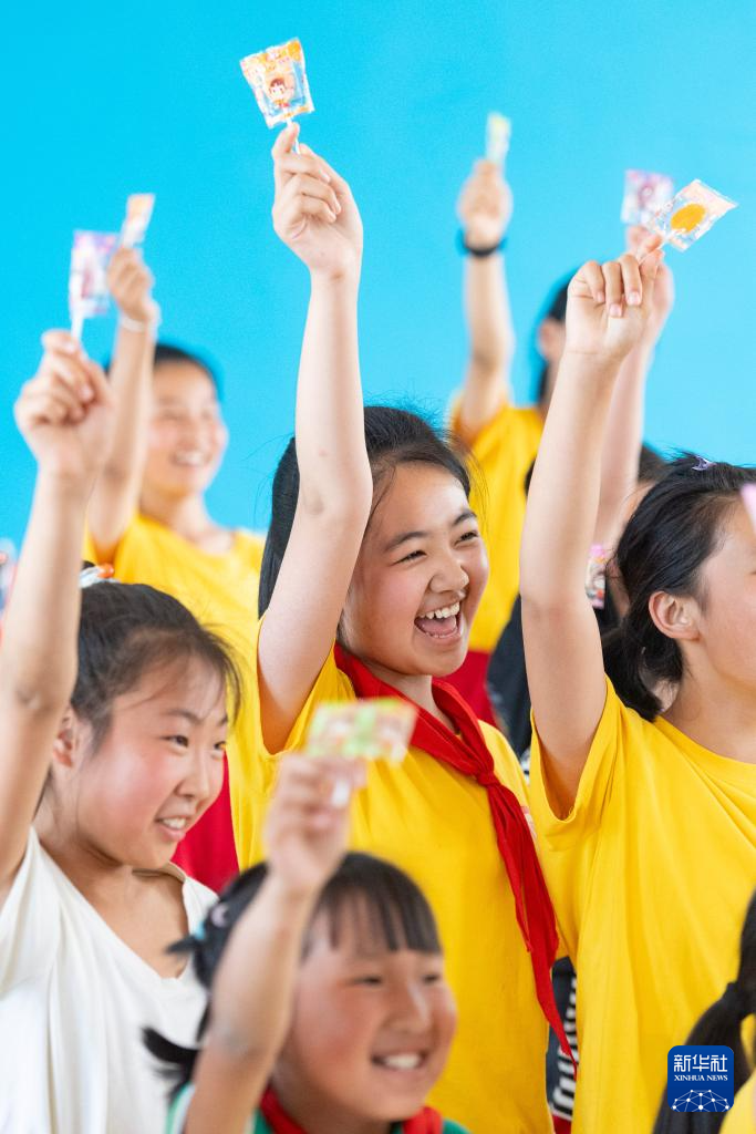 5月30日,在安达市任民镇中心学校,孩子们在合唱后展示老师奖励的糖果。