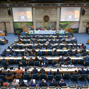 5月29日,在肯尼亚首都内罗毕,中国住房和城乡建设部副部长董建国在第二届联合国人居大会续会上发言。