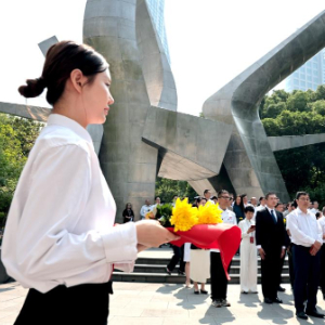 5月30日,劳模工匠和职工代表向五卅运动纪念碑献花。